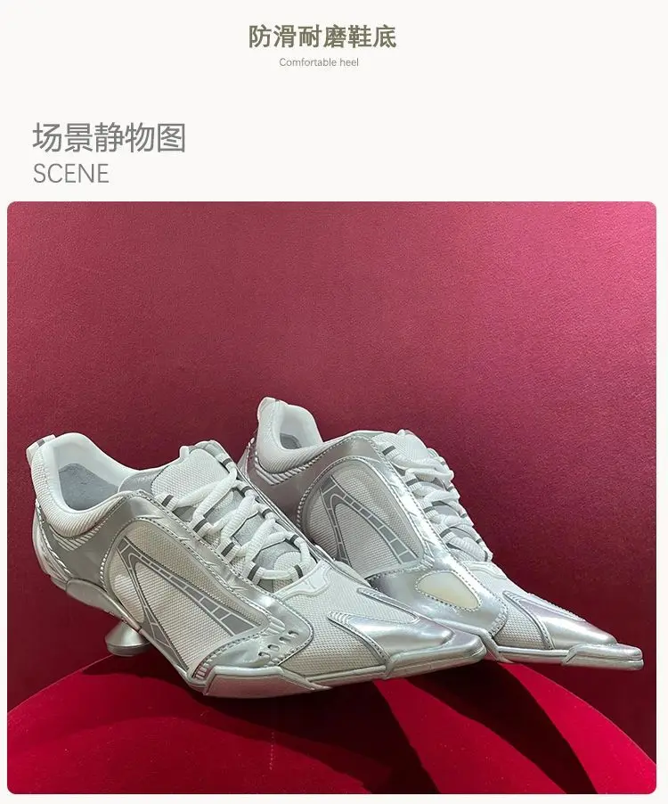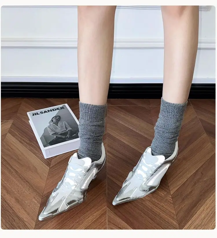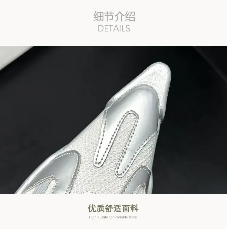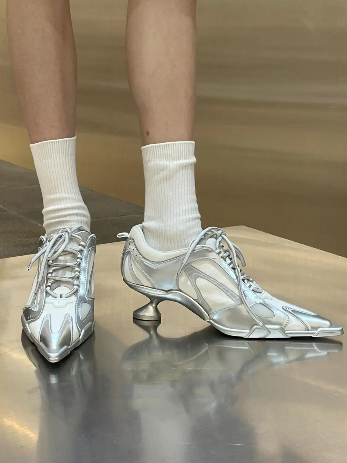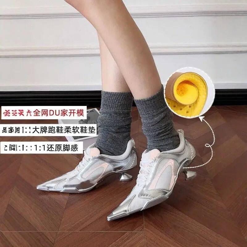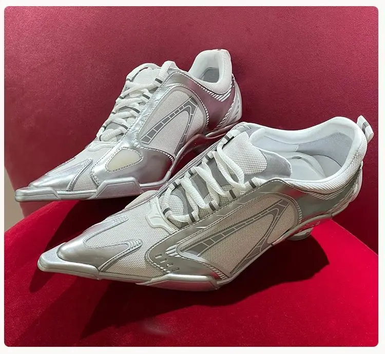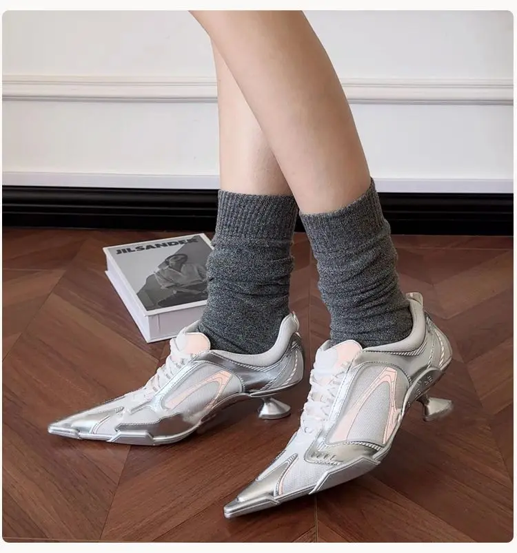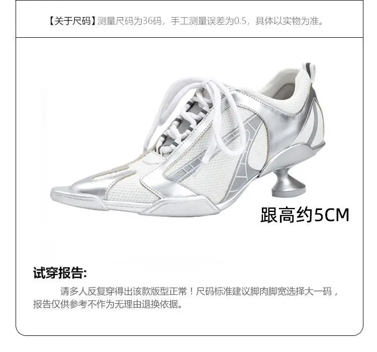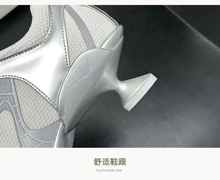Elegant heel women's shoes Big size 43 Silver sheepskin Mesh Sports dance Training mid heel Fashion Pointed Toe Lace-up Pumps