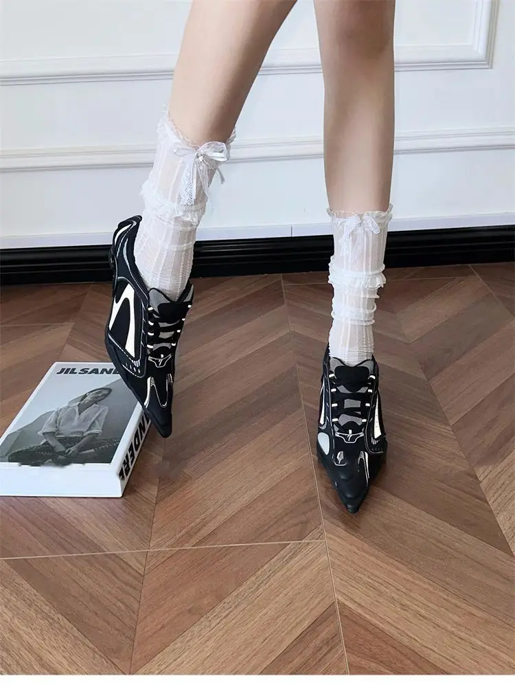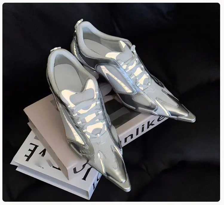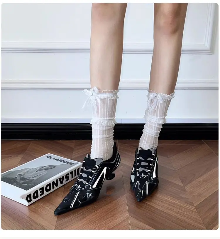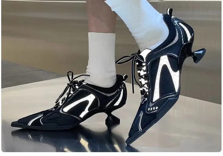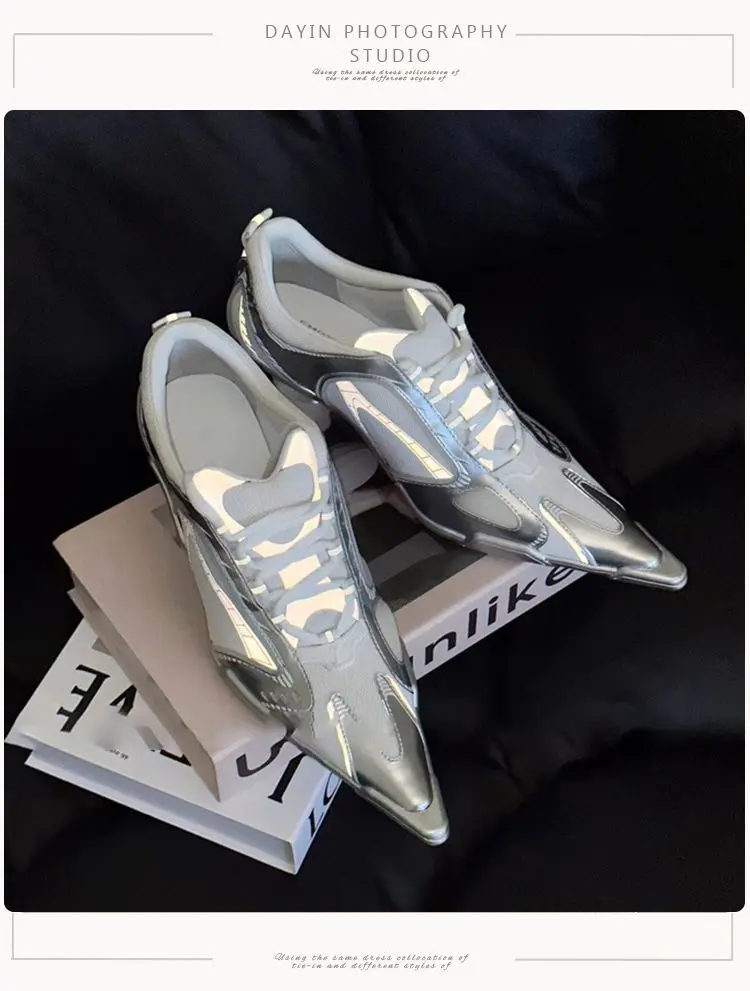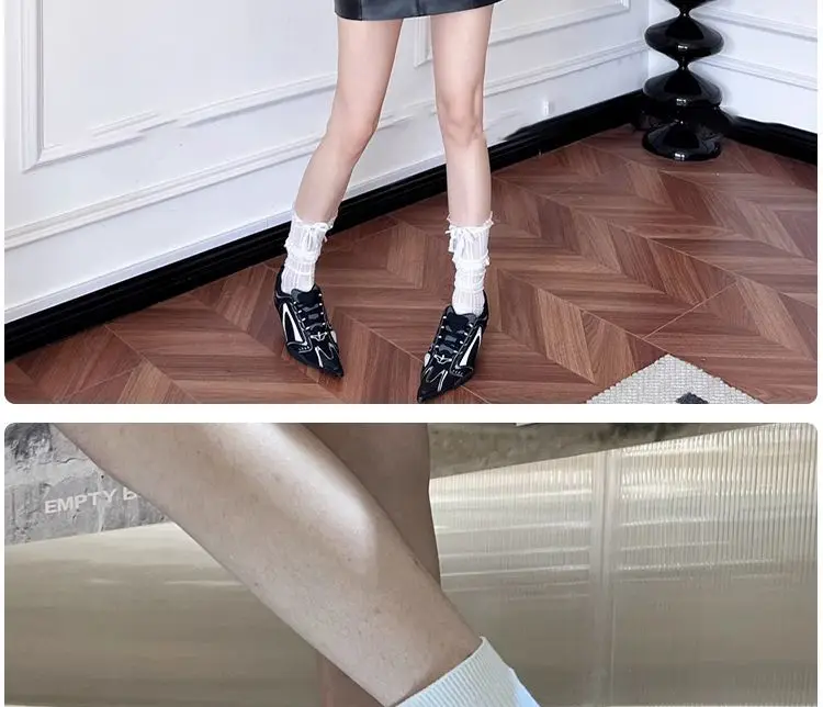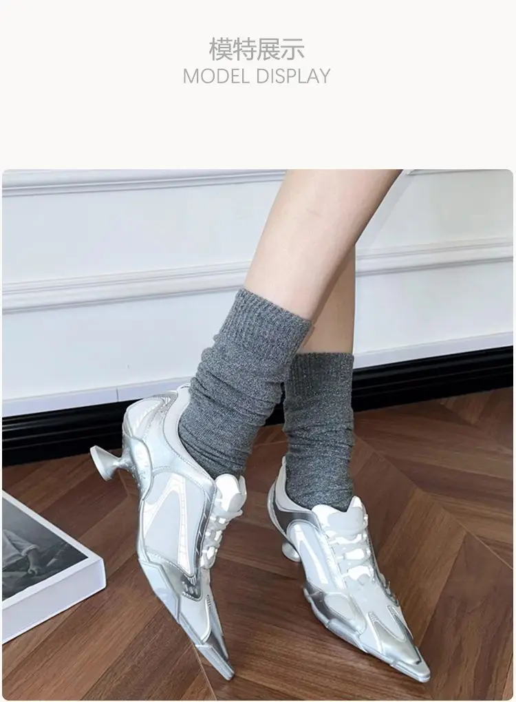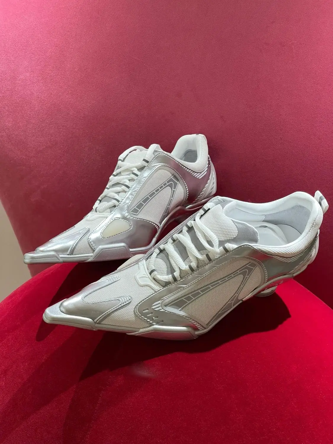 Elegant heel women's shoes Big size 43 Silver sheepskin Mesh Sports dance Training mid heel Fashion Pointed Toe Lace-up Pumps