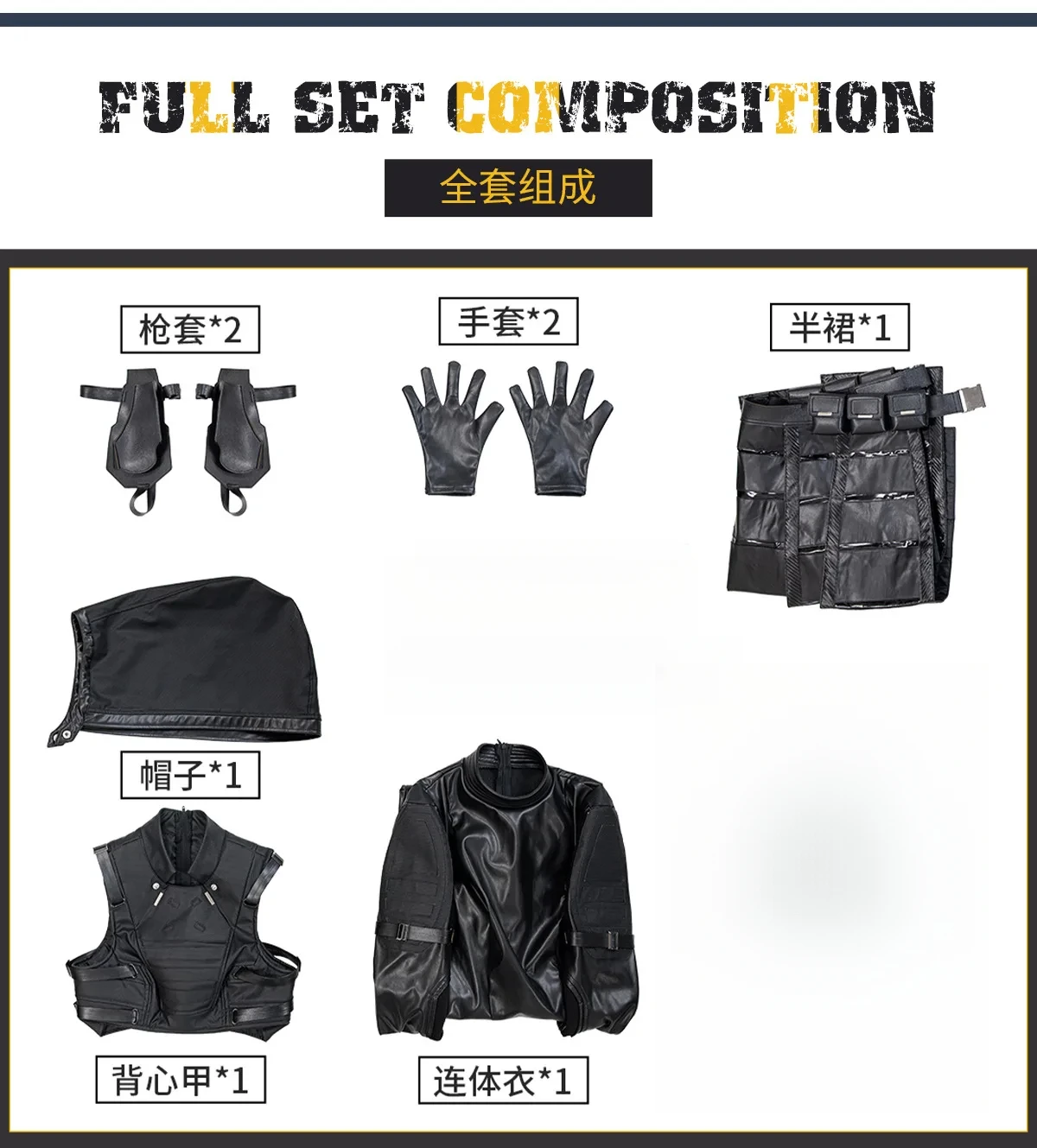 1. Costume(Costume Set:Jumpsuit ,Vest armor ,Half skirt, Hat ,Glove, Holster )Not included Wig and Shoes